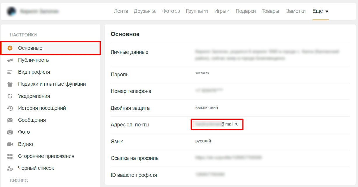 На вкладке «Основные» в строке «Адрес эл. почты» смотрим ту почту, на которую зарегистрирован аккаунт.