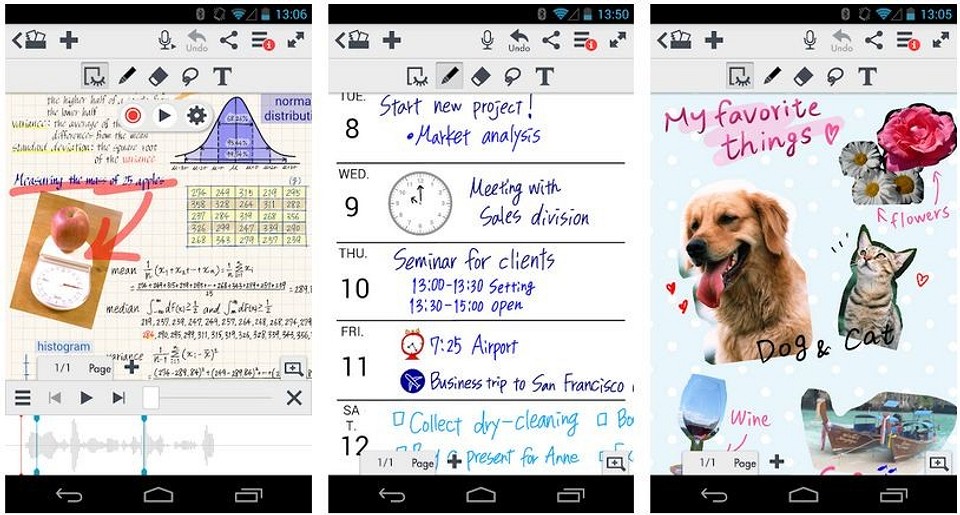 MetaMoJi Note работает на устройствах Android и iOS. Оно подкупает красочными заметками, эскизами и коллекционными альбомами. Для двух систем есть бесплатная версия Lite (скачать для Android и iOS) или полная за 499 рублей / $7.99. Самыми интересными функциями приложения можно назвать возможность создания примечаний в PDF и голосовой ввод. Приложение предоставляет пользователю несколько каллиграфических перьев, чернил, графики, а также макеты для создания текстов или эскизов.
