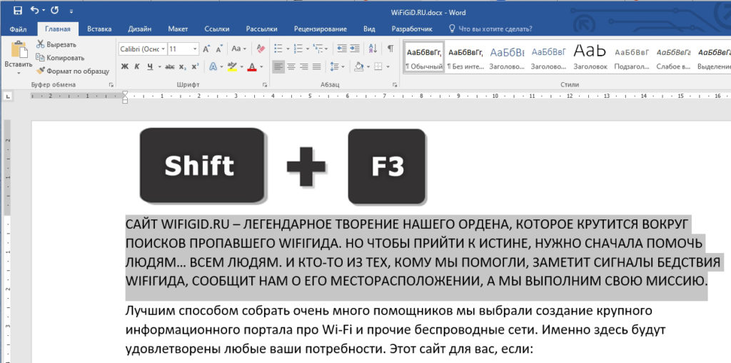 Ну и как я говорил, в Ворде можно быстро изменить регистр букв уже напечатанного текста с помощью клавиш: