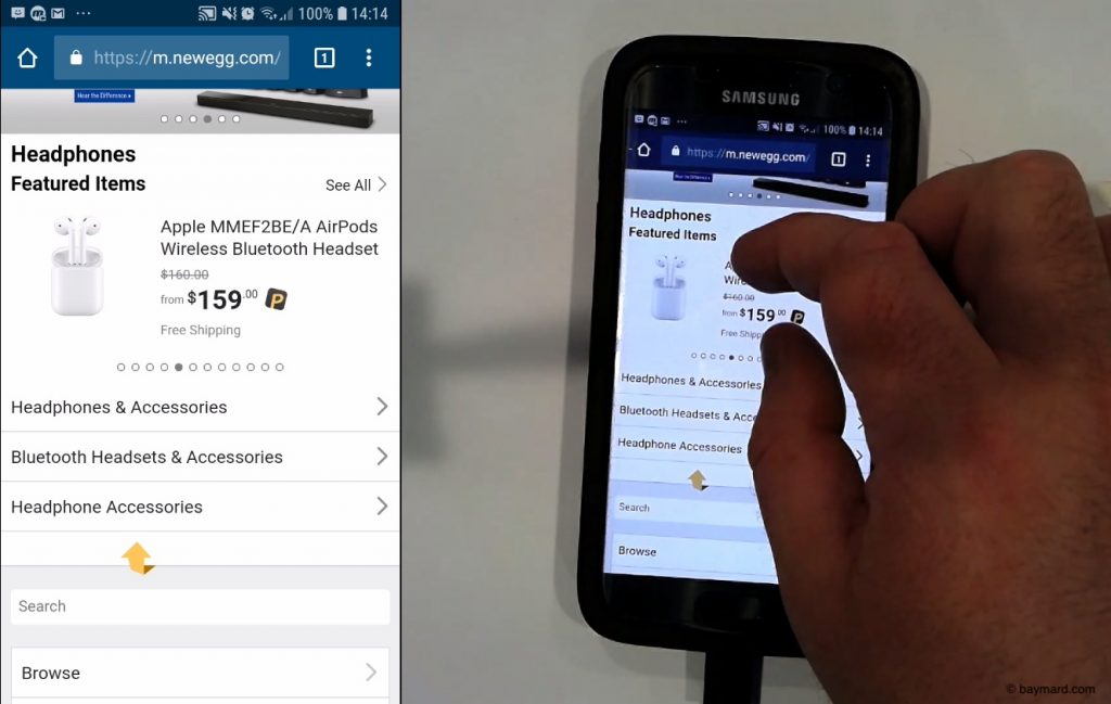 На странице товара сайта Newegg участник пытается увеличить масштаб слайдера, чтобы увидеть цену рекомендуемого товара. Но функция масштабирования с помощью разведения пальцев не работает. Люди будут ожидать, что жесты мобильного управления, такие как сведение пальцев и пролистывание, будут работать при попытке взаимодействовать со слайдером.