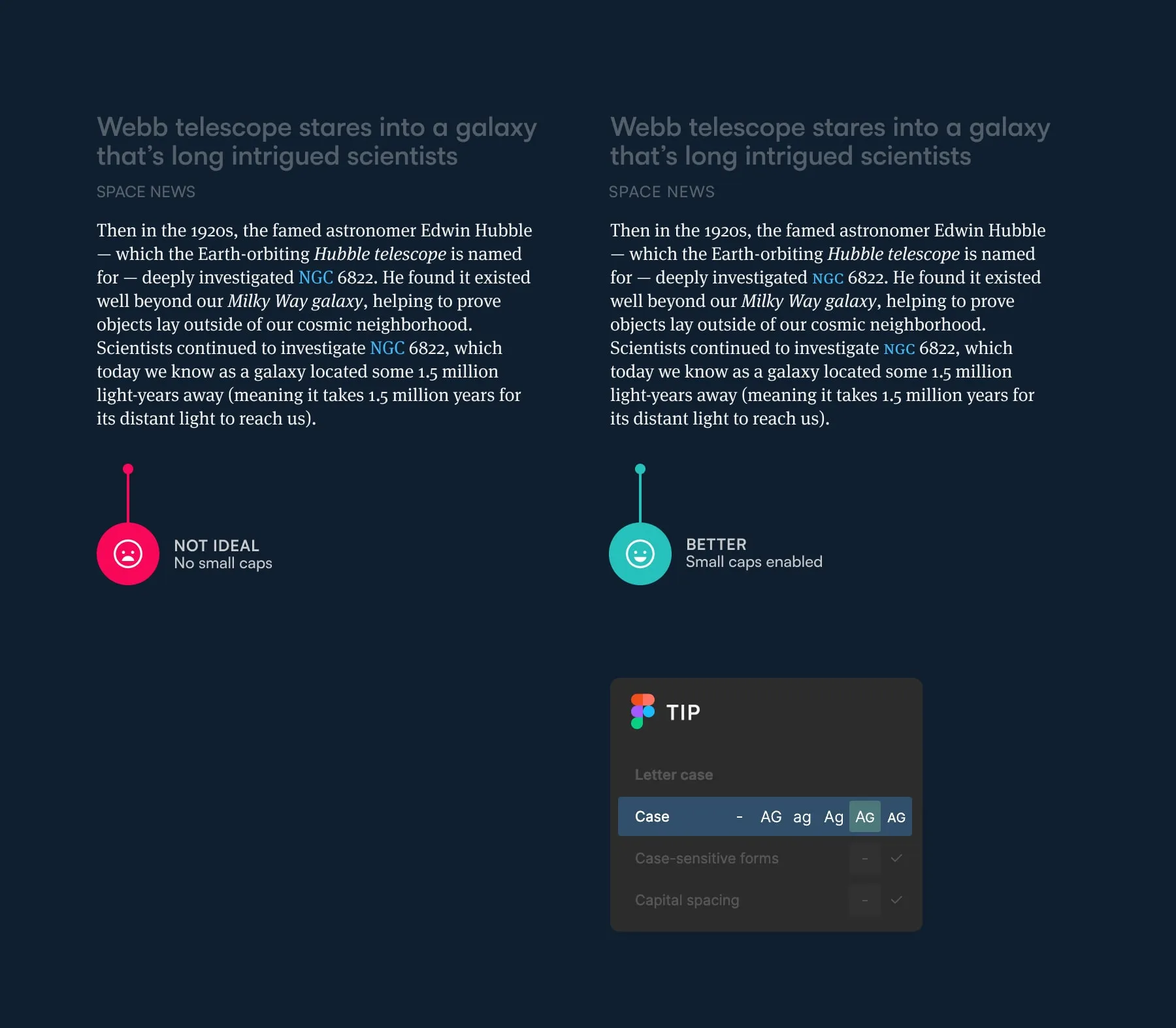 Чем больше непараллельных краев имеет ваш текст, тем выше контраст формы. Контраст высокой контрастности облегчает пользователям распознавание. Если вы хотите упростить чтение текста, подумайте о том, чтобы использовать заглавную стилистику вместо всех кепок на вашем веб-сайте.