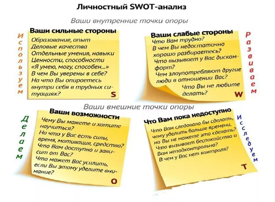 SWOT-анализ личности позволяет посмотреть на себя со стороны и объективно оценить свою способность к достижению успеха. Он помогает составлять более надежные планы, системно подходить к саморазвитию и принимать взвешенные решения в сложных ситуациях.