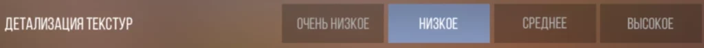 Означает уровень качества и разрешения текстур окружающих вас объектов (стены, двери, коробки и другое). Чем выше уровень детализации текстур, тем более реалистично и детально будет выглядеть графика игры. По нашему опыту рекомендуем ставить на «Низкое», это позволит удерживать FPS на стабильном уровне и играть с приятной графикой не режущей глаза.