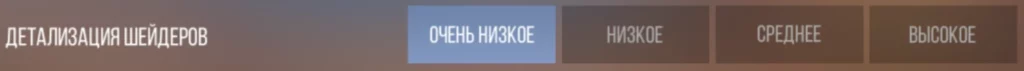 Шейдеры в игре отвечают за отрисовку отображения света, теней, текстур и других визуальных эффектов. При увеличении детализации шейдеров игровая графика становится более реалистичной, динамичной и красочной. Рекомендуем ставить этот пункт всегда на «Очень низкое», чтобы не отвлекаться во время игры на разные блики.