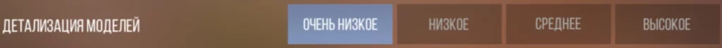 Влияет на улучшение качества и реалистичности графики игровых моделей персонажей и скинов оружия. Ставьте значение этого пункта на «Очень низкое», так как особой разницы между самым низким и высоким значением нет (даже на низкой установке вы сможете отчётливо видеть модели врагов), а вот разница в FPS довольно большая.
