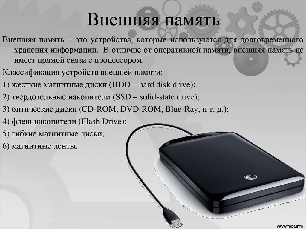 Внешний жесткий диск – это устройство-память, отличающаяся от обыкновенного жесткого диска, тем, что он является носимым, то есть, это устройство памяти подключается к компьютеру посредством USB-порта. Популярность внешних жестких дисков объясняется большим объемом информации, которую можно сохранить на нем (минимум 500 GВ).