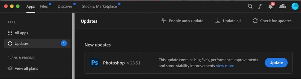 Lightroom CC will close, and the creative cloud app will open with the Updates tab open. Any available updates will appear here. You can click View more to read more about an available update or Update to start the update process.