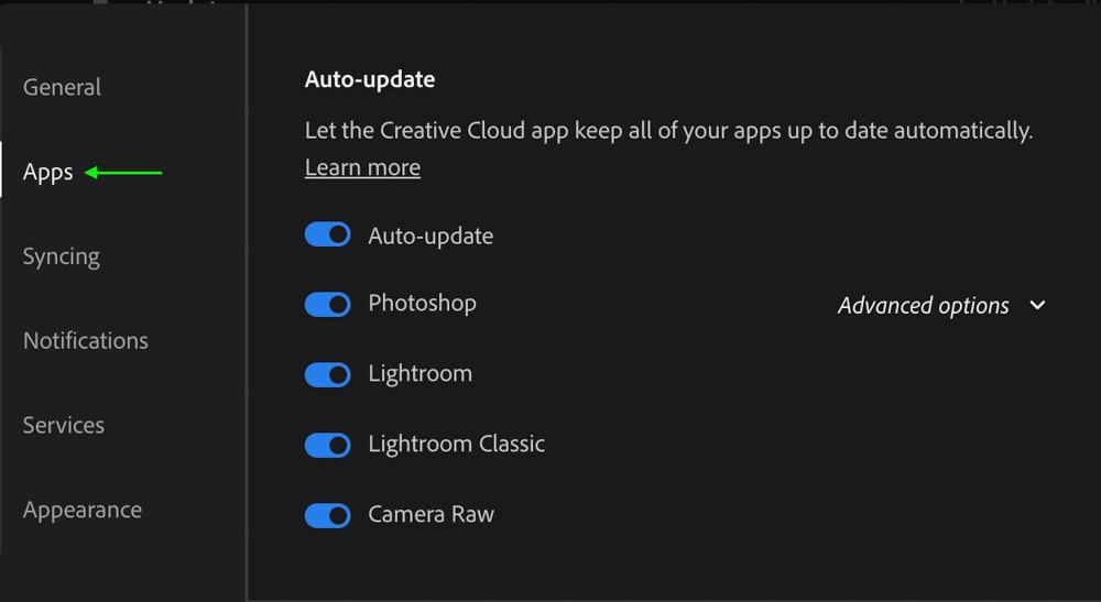 Sometimes, the Enable auto-update button is grayed out or not visible. In this case, with the Creative Cloud app open, head to Creative Cloud > Preferences in the toolbar at the very top of your computer.