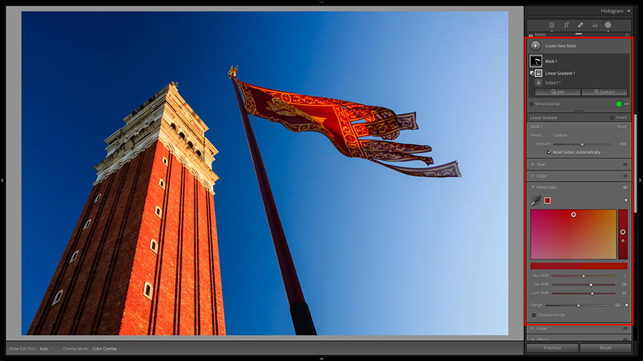 For example, in the photo below, I used Select Subject to mask both the tower and the flag, then subtracted a Linear Gradient so just the flag was masked. Then I used the Color Picker to increase Luminance and Saturation in the flag without affecting the tower, which has similar color.