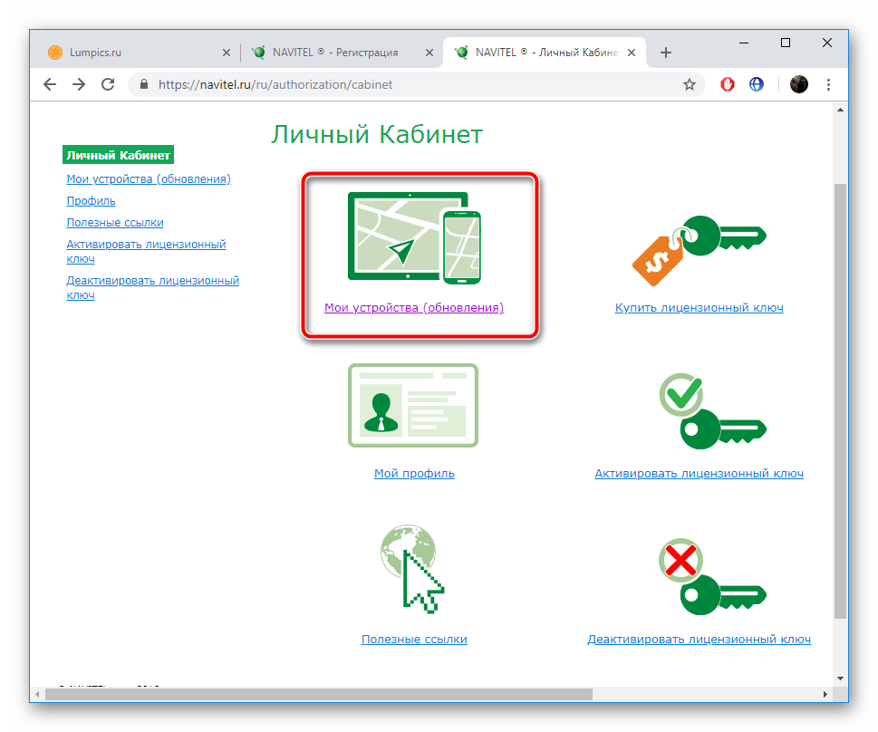 - на официальном сайте navitel.ru заходите в личный кабинет (если вы на сайте в первый раз, то вам сначала нужно зарегистрироваться), выбираете «Мои устройства» — «Обновления»;