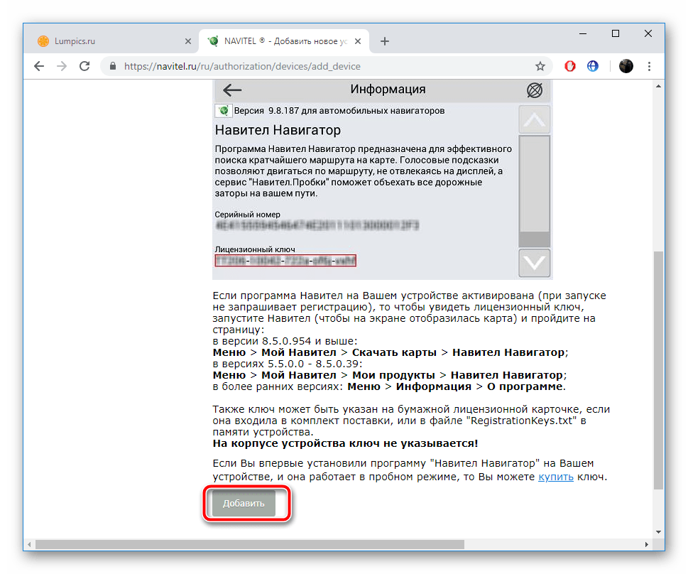 В самом навигаторе также хранится информация о лицензионном ключе. Чтобы узнать откройте в устройстве последовательно пункты меню «Настройки» → «Информация» → «О программе» После ввода ключа программа производит проверку его легальности и при положительном результате включит новое оборудование в личном кабинете со ссылками на имеющиеся обновления. Нажмите соответствующие ссылки.