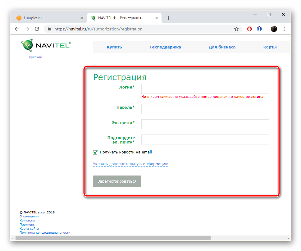 NAVITEL не распространяет свои карты бесплатно, от юзеров требуется наличие аккаунта на официальном сайте и лицензионный ключ, который сохранен в оборудовании. Весь процесс регистрации выглядит следующим образом: