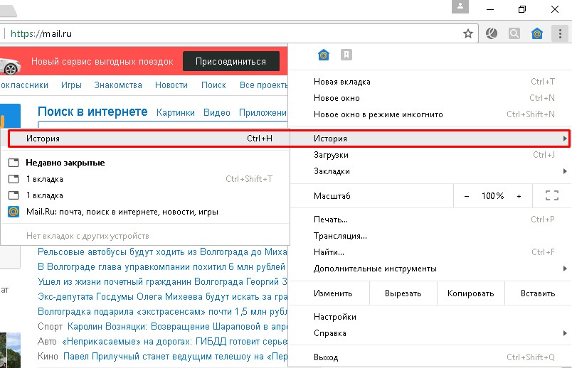 В правом верхнем углу переходим в меню, открываем историю.