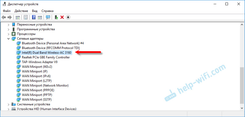Как видите, в моем ноутбуке установлен Wi-Fi модуль Intel(R) Dual Band Wireless-AC 3160. Теперь мы знаем производителя и модель устройства. Но так как обычно основная цель это определение адаптера для поиска и установки драйверов, то этот способ нам не подходит.
