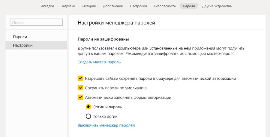 Выручить в такой ситуации может менеджер паролей. Все современные web-обозреватели имеют на борту подобную встроенную функцию и Яндекс Браузер также из их числа. По умолчанию приложение будет автоматически запоминать введённые в форму авторизации на сайте данные в локальную базу или, если включена синхронизацию, то и в «облако» тоже. Дополнительно защитить базу паролей поможет специальный мастер-код.