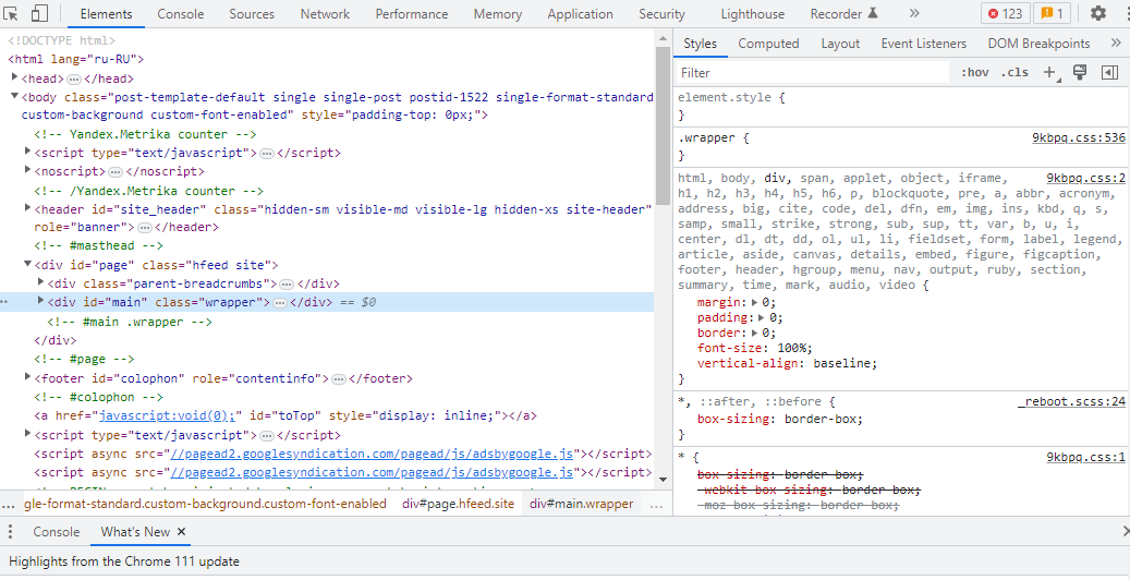 - Elements — показывает верстку страницы и позволяет ее менять.