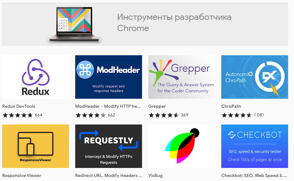 Встроенного DevTools может хватить для большинства задач. Но если нужно больше функций, среди расширений для Chrome есть множество инструментов для разработки. Например, панель отладки для React, Redux, инструмент для проверки точности верстки.