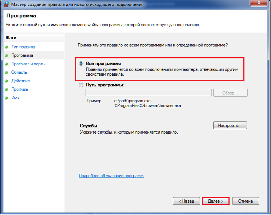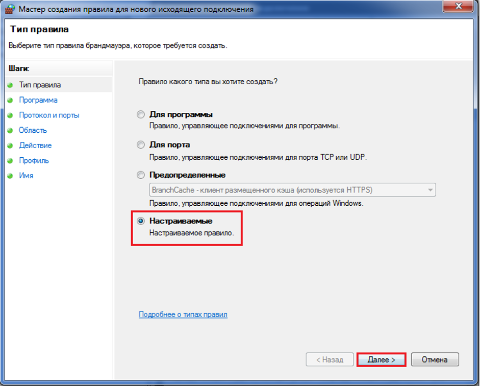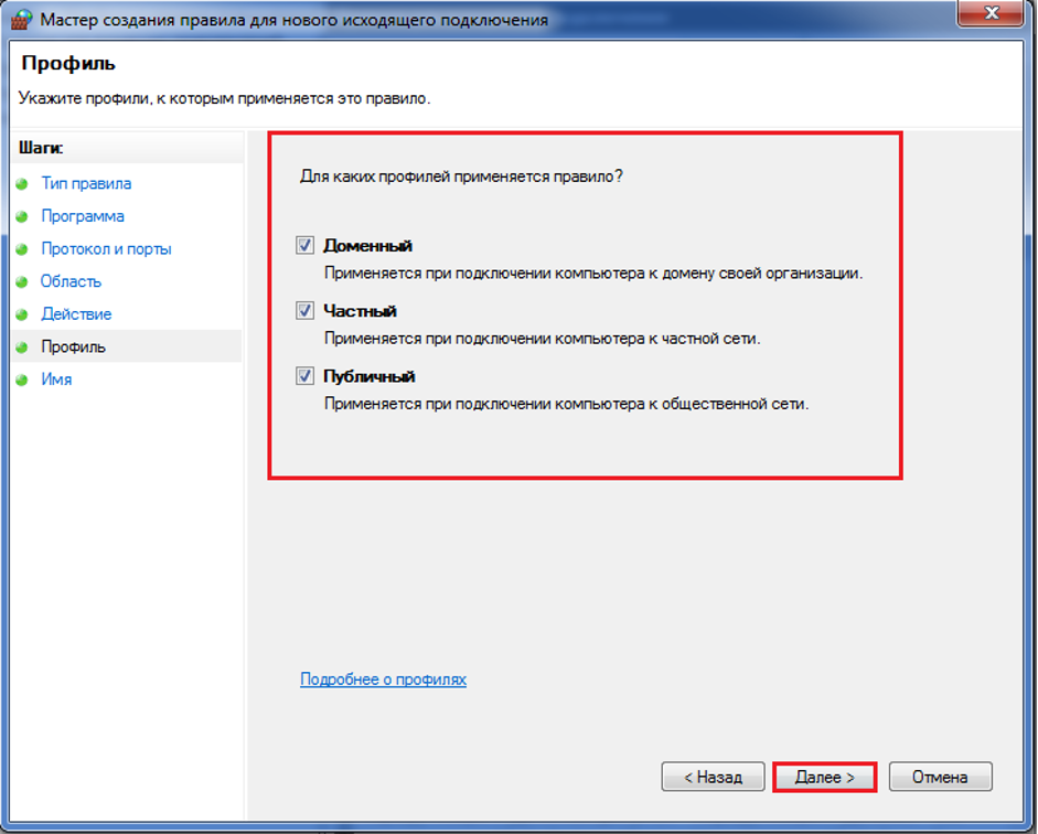 В окне «Профиль» отметьте все пункты, к которым будет применяться правило, нажмите «Далее».