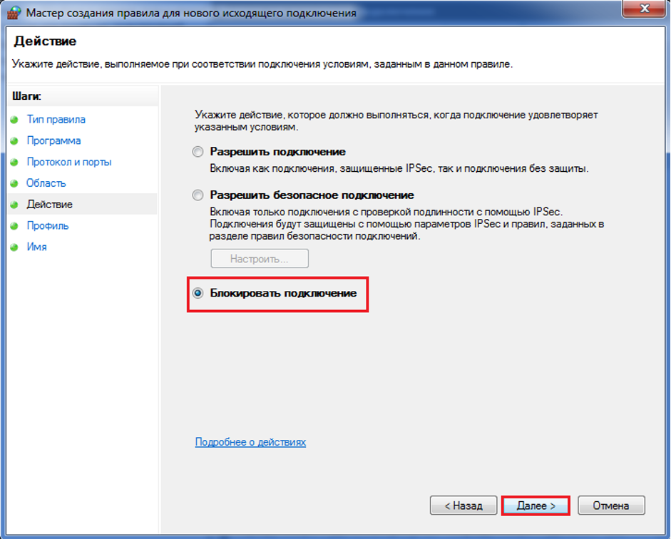 Обязательно выберите опцию «Блокировать подключение» и нажмите «Далее».