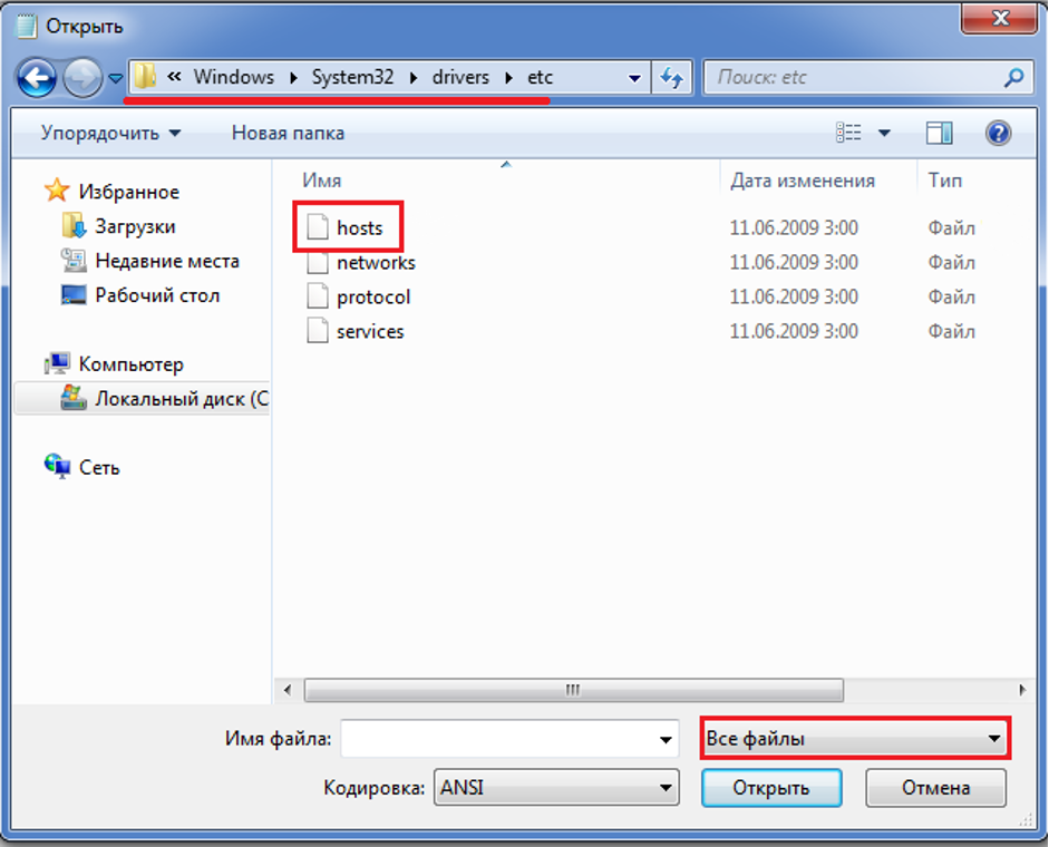 - Откроется диалоговое окно. Перейдите в папку по адресу C:\Windows\System32\Drivers\etc. Оказавшись там, поставьте отображение всех файлов. Выберите файл «hosts». Нажмите на кнопку «Открыть».