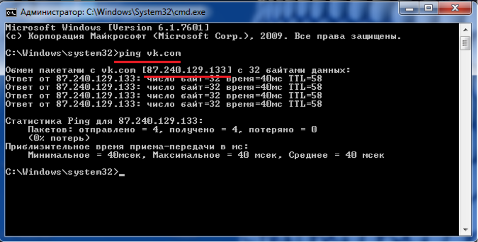 В открывшемся окне введите команду ping адрес сайта. Например, ping vk.com: