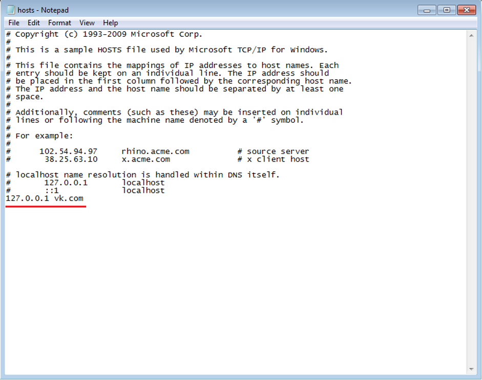 - Перейдите к последней строке страницы и добавьте свою собственную строку. Допустим, мы блокируем «Вконтакте». Для этого введите «127.0.0.1» и добавьте ссылку на сайт, который нужно заблокировать, как показано на изображении ниже.