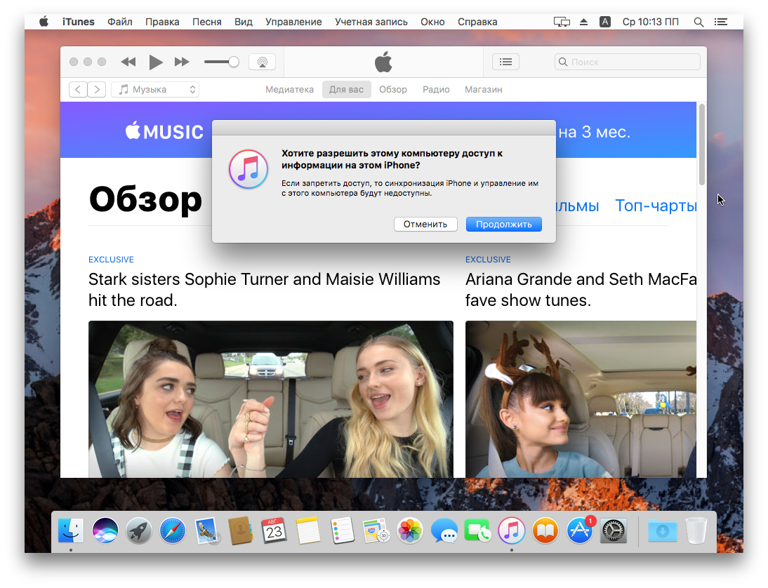 Убедитесь, что мобильное устройство включено и разблокировано, затем подключите его к компьютеру. В первый раз iOS запросит разрешение на доступ к медиафайлам и вам нужно будет дать его.