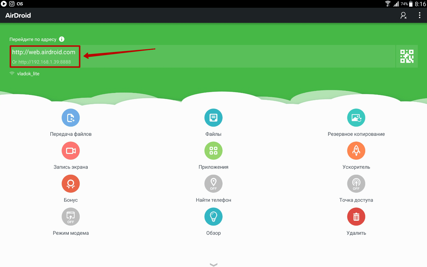 4. Далее вы сможете передавать на компьютер файлы, записывать экран, делать скриншоты и совершать прочие действия. На ПК для этого нужно открыть браузер и перейти по адресу, отображающемуся в верхней строке приложения.