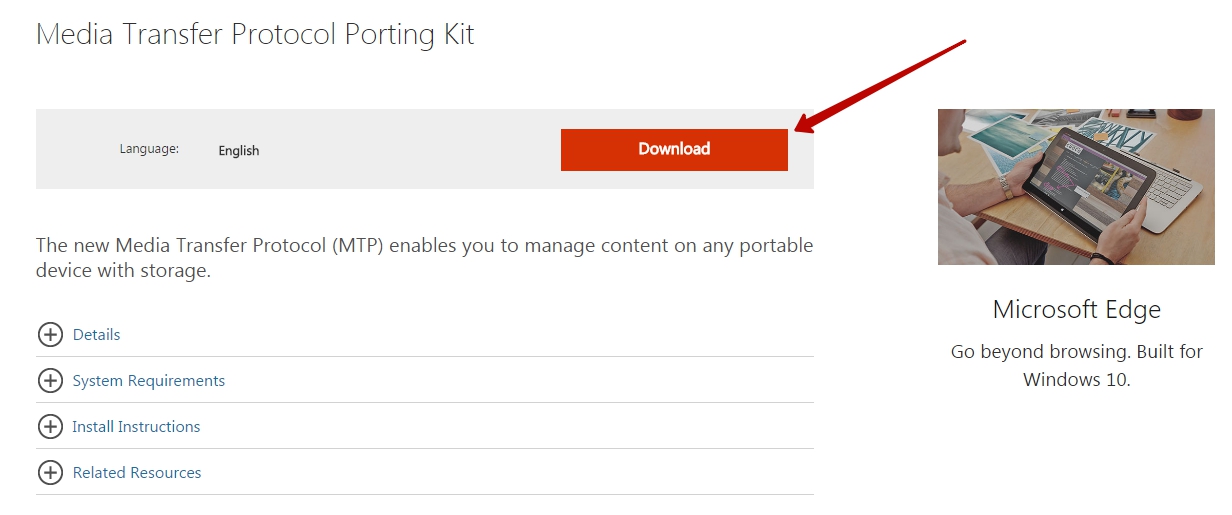 Чтобы загрузить Media Transfer Protocol Porting Kit на компьютер, посетите официальную страницу компании: . Установка протокола займет немного времени, а после завершения процесса ПК необходимо перезагрузить. Если проблема заключалась в этом, мобильное устройство определится на компьютере.