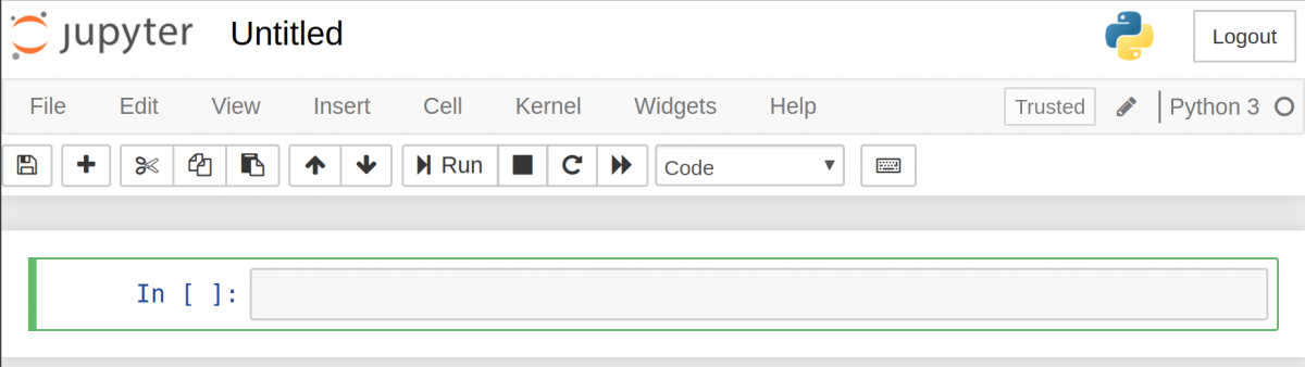 Для создания notebook выберите «New» в верхнем меню, а потом «Python 3». Теперь страница в браузере будет выглядеть вот так: