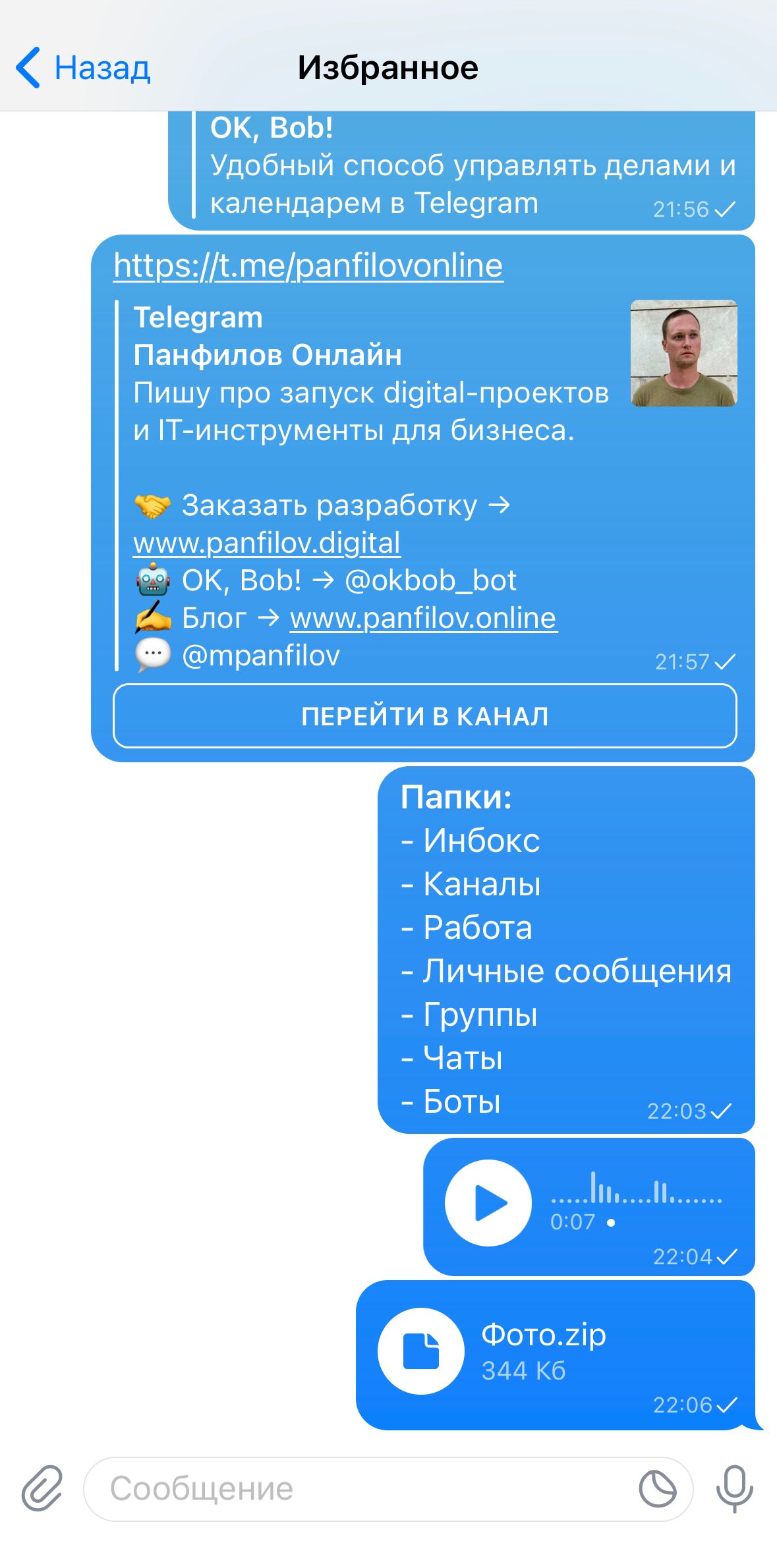 Как создать папку с закладками в Телеграмме? Самостоятельно ничего делать не нужно, она уже есть в меню. Для отображения хранилища в окне со всеми чатами отправьте в него любое сообщение или файл.