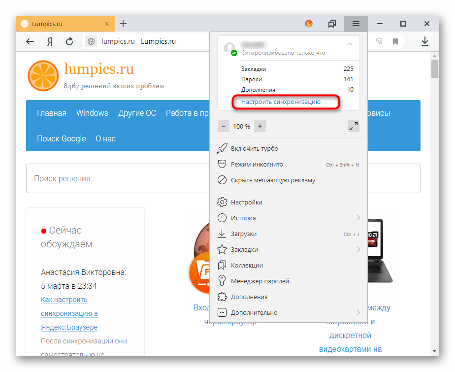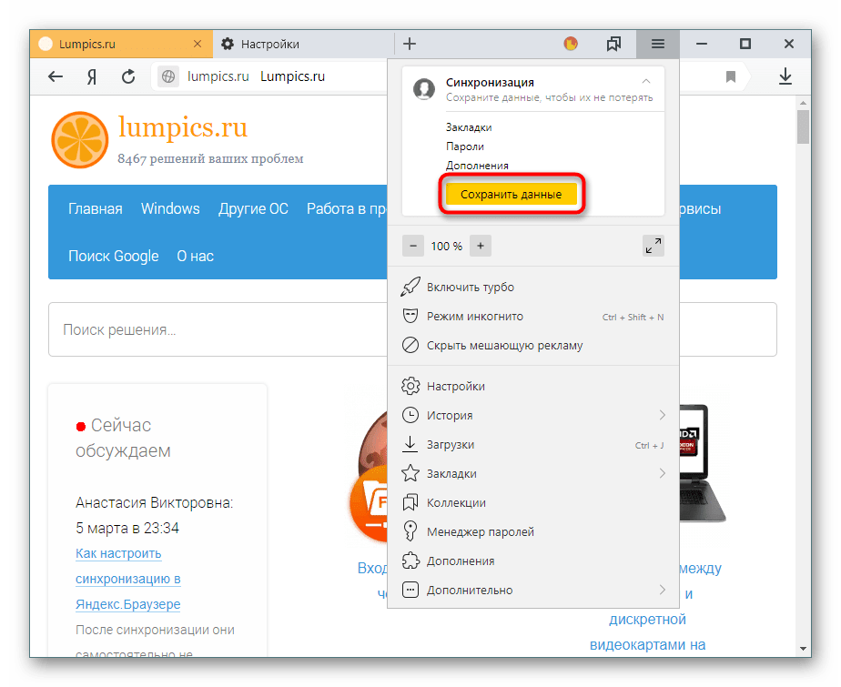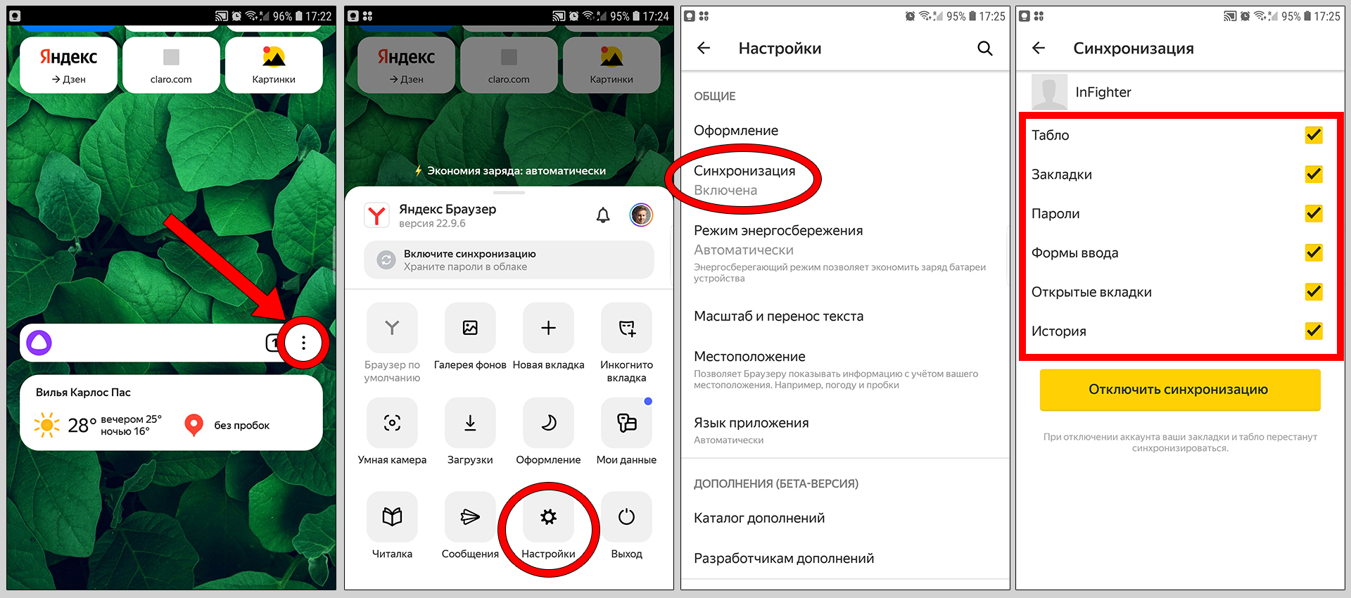 Где находятся настройки синхронизации в мобильном браузере Яндекс