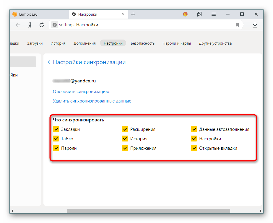 По умолчанию синхронизируются пароли, сайты на Табло, закладки, формы автозаполнения и открытые вкладки