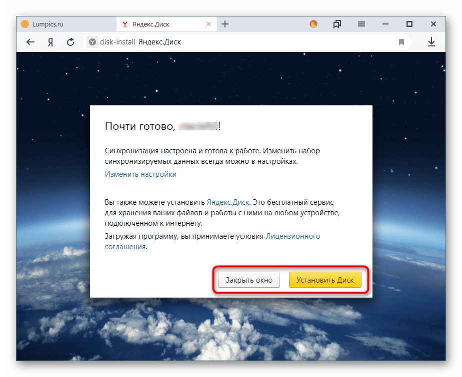 Сервис предложит установить Яндекс.Диск, о преимуществах которого написано в самом окне. Выберите «Закрыть окно