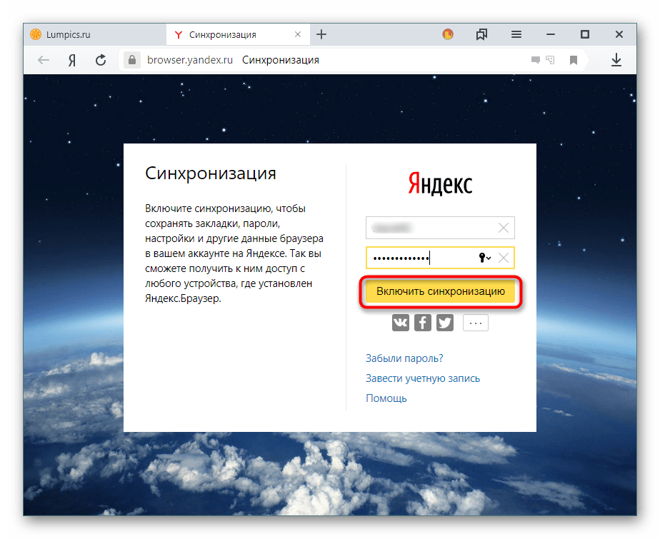 После регистрации вы вновь окажетесь на странице включения синхронизации. Логин уже будет подставлен, вам лишь остается ввести пароль, указанный при регистрации. После ввода нажмите на кнопку «Включить синхронизацию