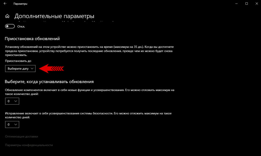 Далее опускаемся ниже до пункта: «Приостановка обновлений». Вы можете выбрать дату до которой хотите отложить обновления, но максимум 35 дней.