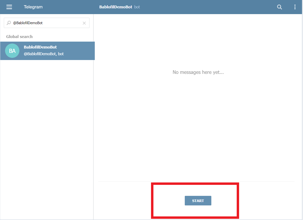 Теперь, в списке контактов найдите созданного вами бота по имени (в моем случае, BablofilDemoBot), и нажмите кнопку start