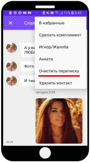 Удалить фото из диалога на мобильном телефоне в версии Android, на iPhone действуйте следующим образом: