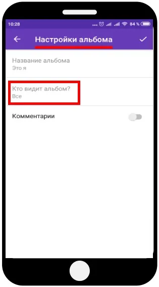 В отличие от компьютерной версии, в мобильной указать приватность альбома можно по значку шестеренки, расположенной рядом с названиями: «Основное» и «Разное».