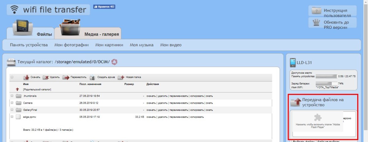 - Если все сделано верно, то перед вами появится десктопная версия интерфейса Web File Transfer. Перейдите в раздел «Передача файлов на устройство»