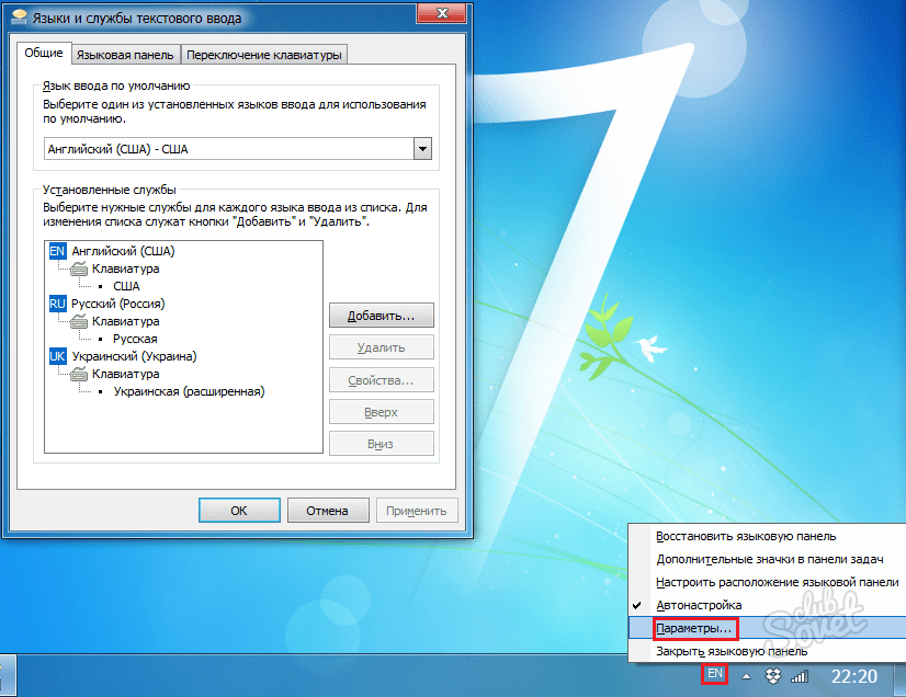 При этом языковая панель располагается в правом нижнем углу. При использовании такого варианта необходимо будет просто навести стрелку на название языка, после чего кликнуть левой кнопкой мыши, после чего выбрать нужный вариант язык из представленного меню. В большинстве случаев для получения требуемого переключения необходимо произвести перезагрузку устройства после сохранения настроек.