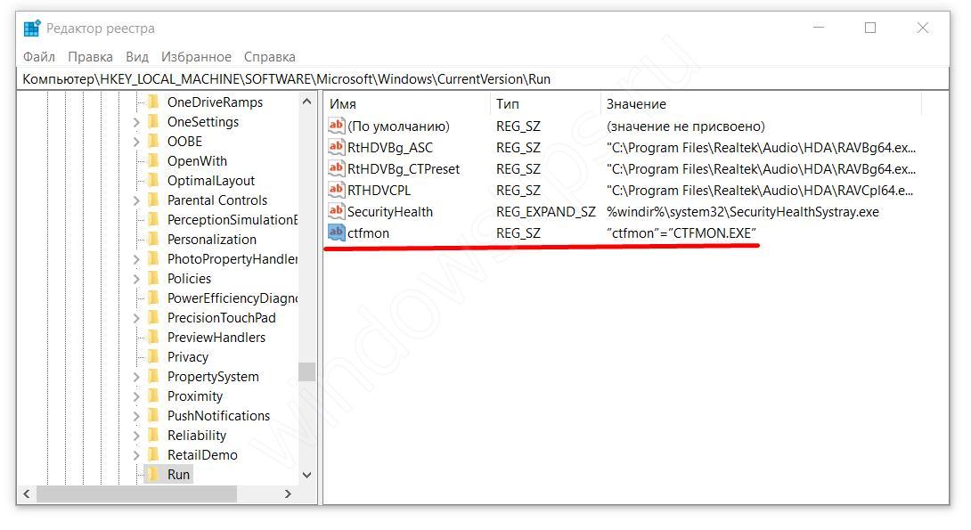 В редакторе реестра (в окне «Выполнить» введите команду regedit) перейдите в каталог HKLM/Software/Microsoft/Windows/CurrentVersion/Run и добавьте строковый параметр — «ctfmon»=»CTFMON.EXE”.