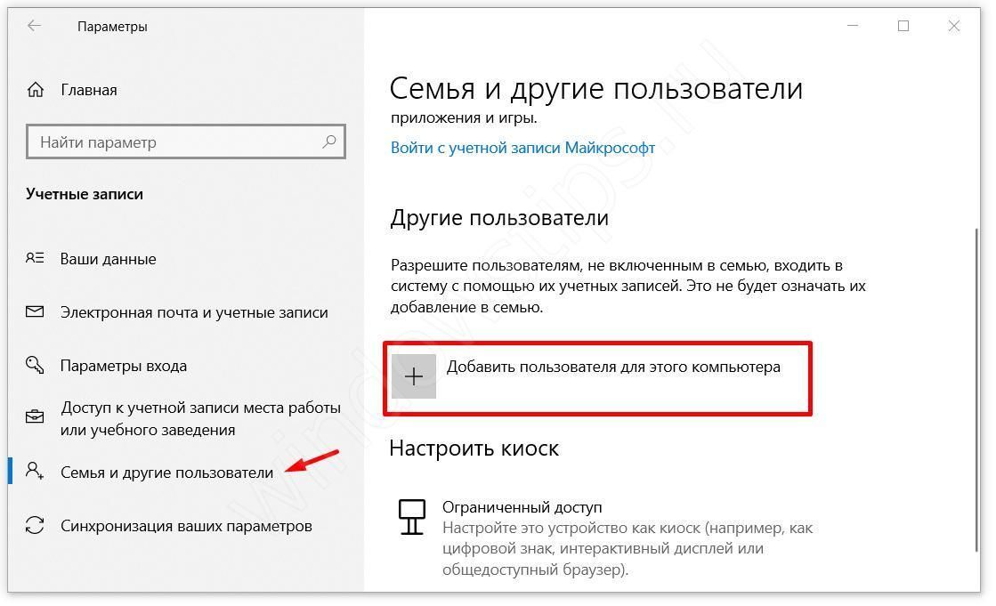 Зайдите в «Параметры», «Учетные записи», «Семья и другие пользователи».