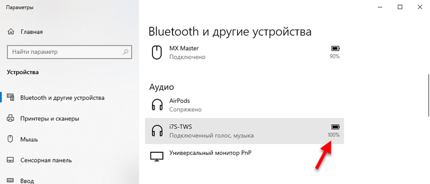На компьютере уровень заряда батареи можно посмотреть в параметрах Bluetooth.