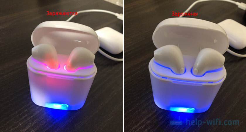 О том, что идет зарядка, можно понять по индикатору на кейсе. На I7s, например, он мигает красным цветом. При полной зарядке перестает мигать. Все зависит от модели. На некоторых индикатор сначала горит оранжевым цветом, а после полной зарядки зеленым. Реакция по индикатору (если он есть) должна быть после подключения питания.