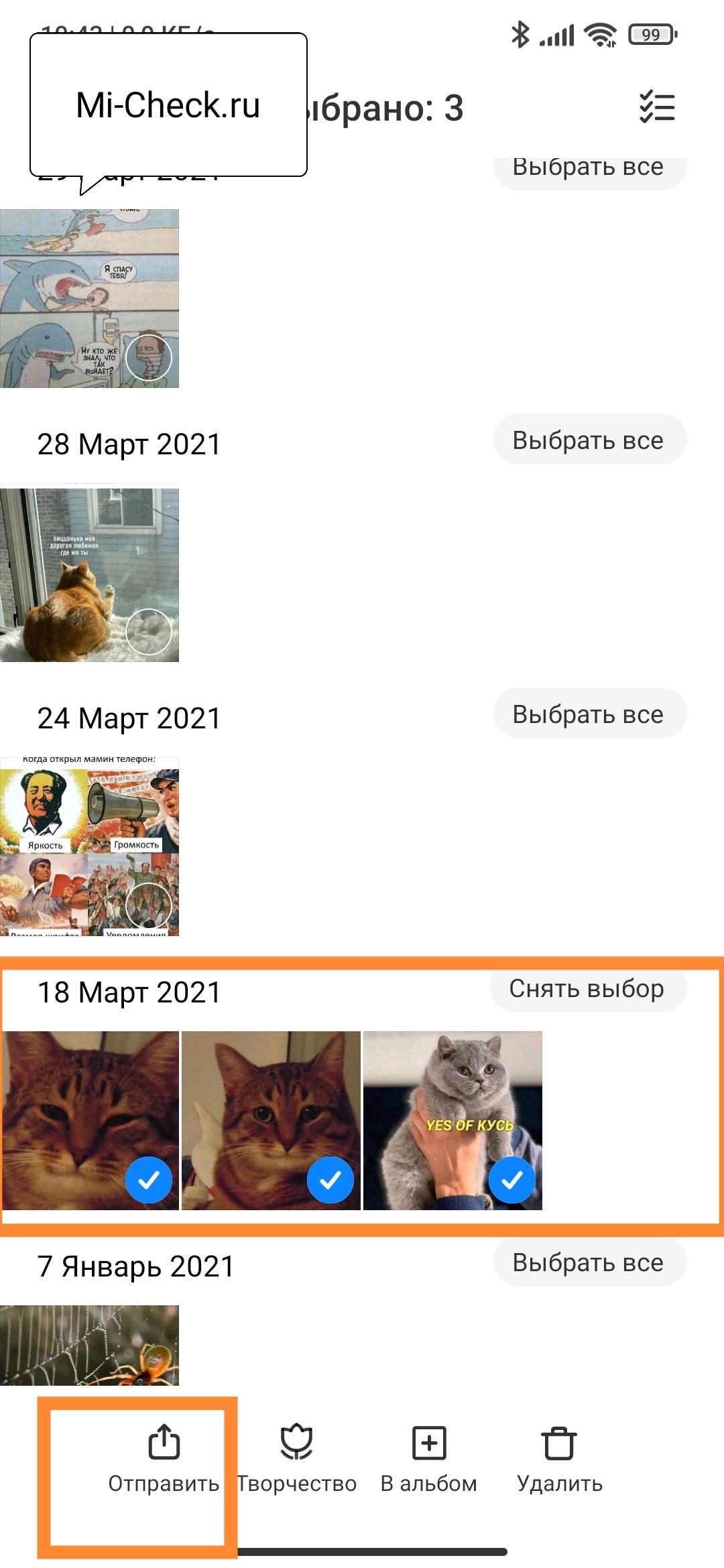 - Откройте галерею телефона и выберите фото, которые вы хотите скинуть через облако.