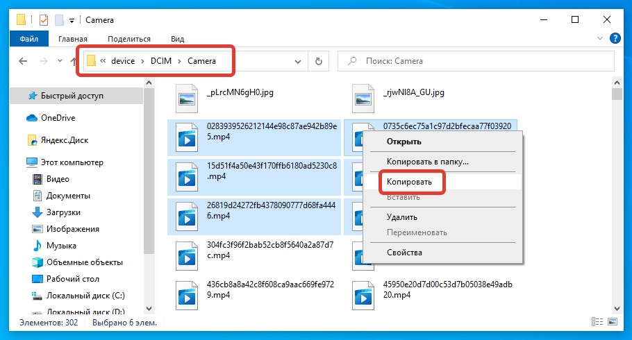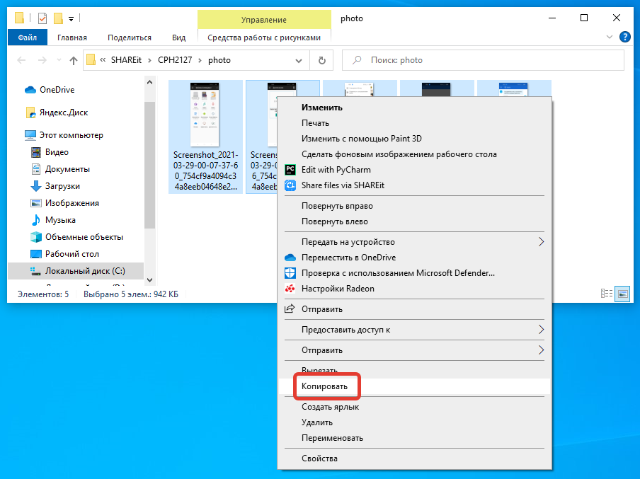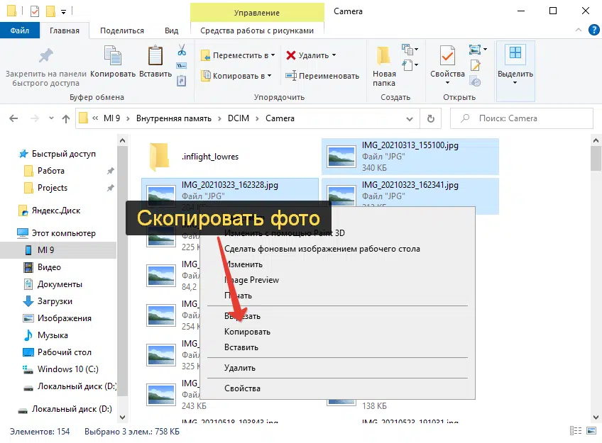 Остается только найти нужные снимки, скопировать их и вставить в нужный каталог. Для копирования выделите один или несколько файлов, кликните по одному из них правой клавишей мыши и выберите соответствующий пункт. Или воспользуйтесь комбинацией Ctrl + C.