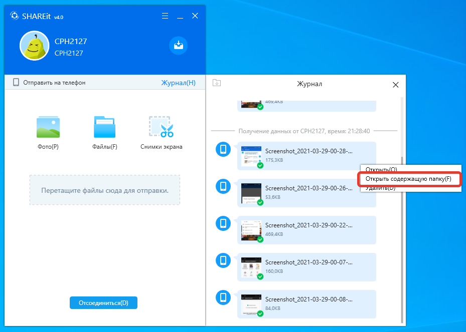 - На десктопе раскрыть диалоговое меню одного из пересланных файлов, выбрать пункт «Открыть содержащую папку».