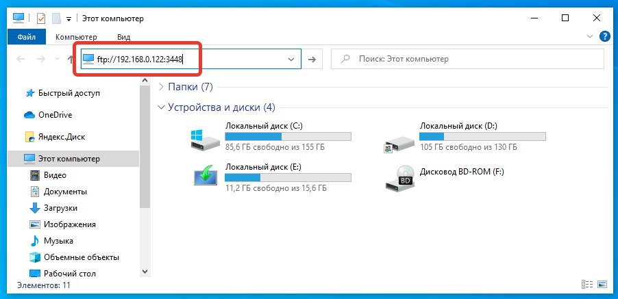 - Раскрыть файловый менеджер на компьютере и ввести в адресную строку указанную в смартфоне ссылку.