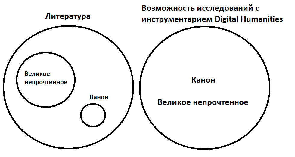 Объём великого непрочтенного гораздо больше объёма канонических текстов (канона), но непрочитанное тоже является частью литературы и может быть объектом исследования — круг№1. Проблему исследования огромного объёма информации может помочь решить инструментарий Digital Humanities, с помощью которого можно исследовать и канонические тексты в том числе. Круг №2 как объединяющая сфера методологии.